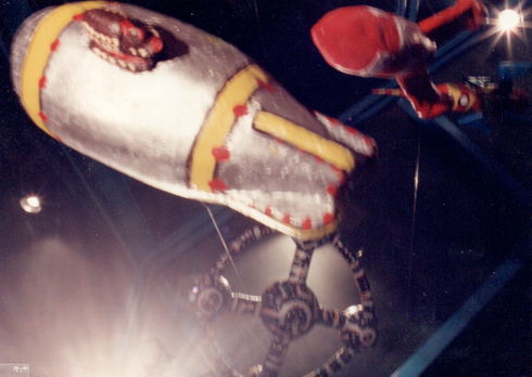 Anos 1990, projeto de vitrine com temática espacial e objetos em papier mâché para a marca de vestuário Kitsch Kid's. Em colaboração com Líbero Malavoglia e Clélia Almeida.