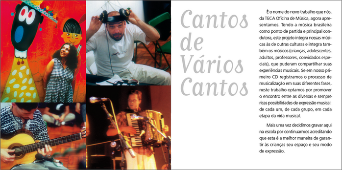 Design, ilustração e tratamento de imagem para capas e encartes de CDs e DVDs da Teca Oficina de Música: Canto do Povo Daqui, Cantos de Vários Cantos, Música pra Todo Lado, Nós que Fizemos, Passarinhada, entre outros. Desenhos dos 'amigos músicos' por Vera Barros e Carlos Barmak, e desenhos e esculturas por alunos da Teca Oficina de Música.